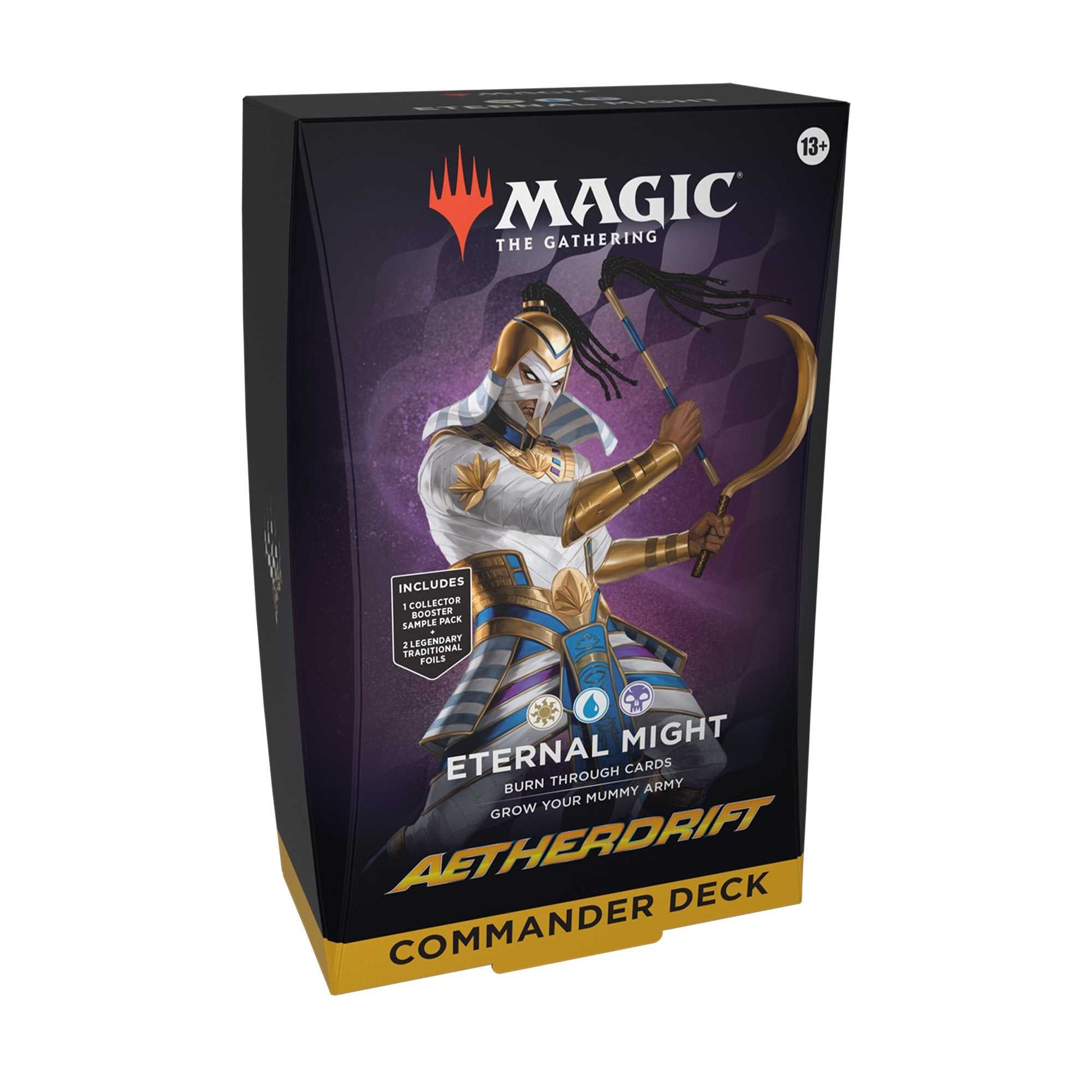 This bundle includes 2 of each Aetherdrift Commander Deck, with 2 Living Energy decks and 2 Eternal Might decks. Each includes 1 deck of 100 Magic cards (98 nonfoil cards and 2 Traditional Foil Borderless Legendary cards), a 2-card Collector Booster Sample Pack (contains 1 Traditional Foil or nonfoil alt-border card of rarity Rare or higher and 1 Traditional Foil Uncommon card), 10 double-sided tokens, 1 deck box (can hold 100 sleeved cards), 1 strategy insert, and 1 reference card.