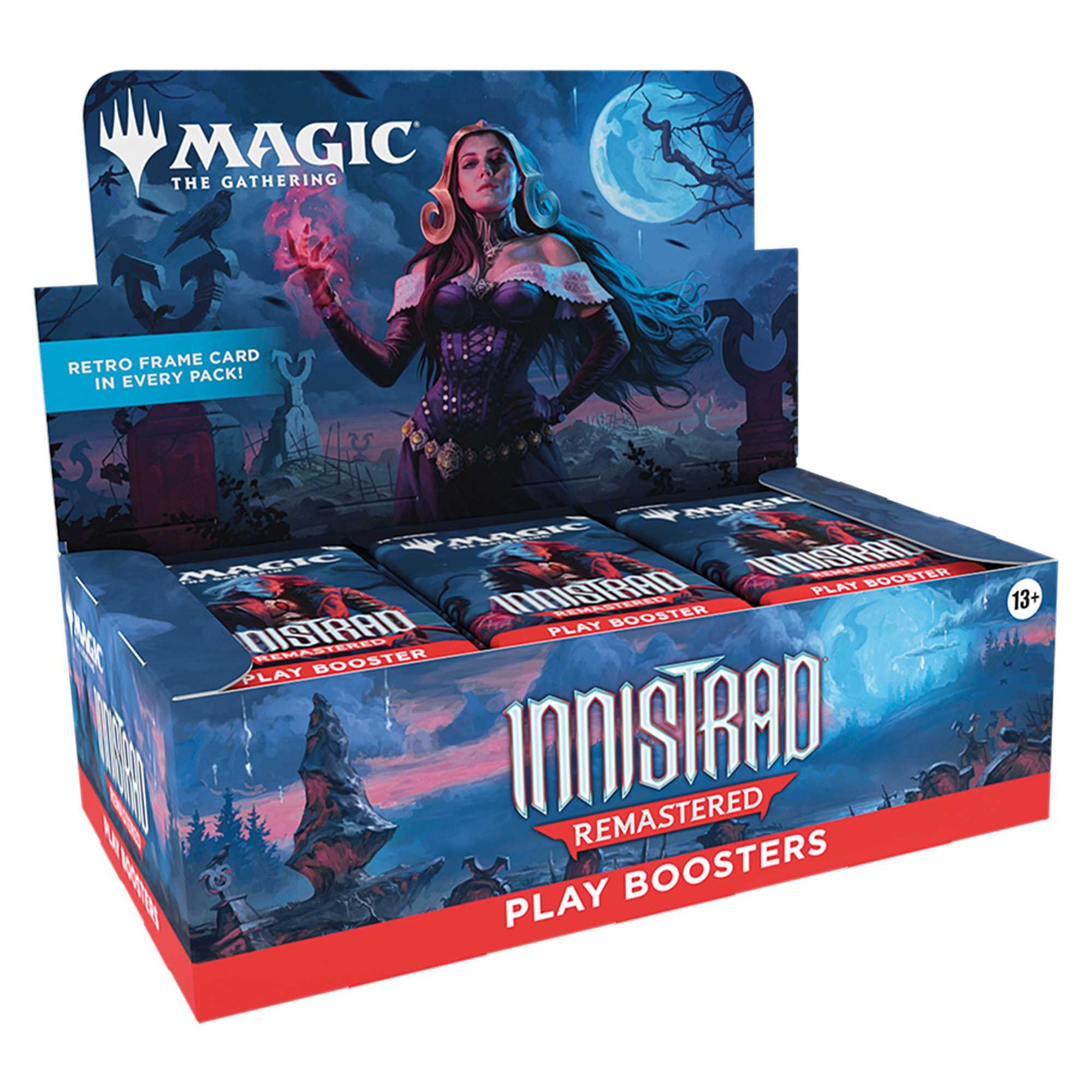 Sink your teeth into the very best of Magic’s spookiest gothic horror setting and rediscover everything you love to fear. This Innistrad Remastered Play Booster Box contains 36 Play Boosters, perfect for both Limited play and opening packs just for fun. Each Play Booster contains 14 Magic: The Gathering cards and 1 Token/Ad card, Helper card, or Art card, including 1–4 cards of rarity Rare or higher and 3–6 Uncommon, 6–9 Common, and 1 Land cards. Each Play Booster arrives nostalgia-packed with a Retro-frame card and 1 card of any rarity is Traditional Foil. Foil Borderless Mythic Planeswalker in <1% of boosters. Traditional Foil Land replaces a Land in 20% of boosters.